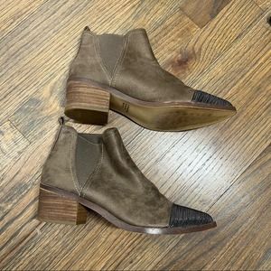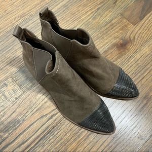 Brown ankle booties with an edgy chain toe detail. Stacked block heel and stretchy side paneling. Slip on style. Faux leather suede. Chocolate brown with a gunmetal / silver hardware on the toe. Size 8.5