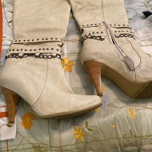 Up to knee boot, 4 inch heel, chain around ankles, used, wear and tear as seen in pictures