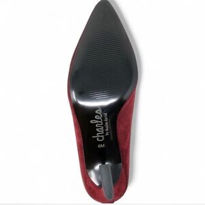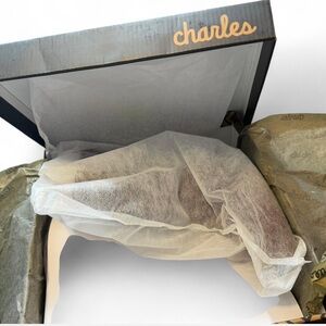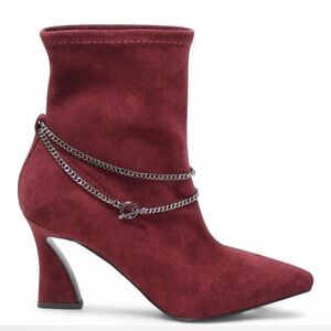 Chain Pointed Toe Bootie. Pull on style featuring a draped chain with sleek pointed toe and flared statement heel. Approximately 3.25” heel height. Chain is removable with toggle. NEW WITH BOX