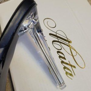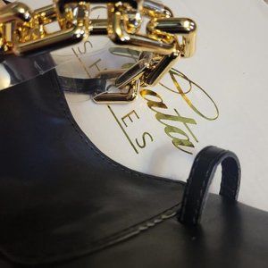Sandal is highlighted with a chain strap for an edgy flair and a tall stiletto heel that lends a tasteful lift.