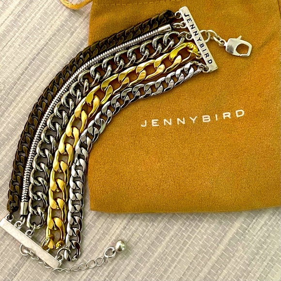 Beautiful multicolored chainlink cuff bracelet with adjustable clasp. Jenny Bird classic cuff bracelet features five multicolored chains linked together in one cuff bracelet. Silver, gold, antique silver and bronze.