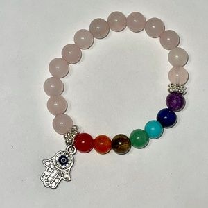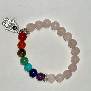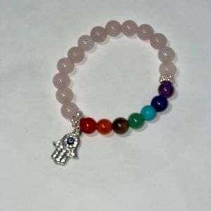 Chakra gem stone beads with Pink Aventurine beads ,Hamsa hand charm, elasticated.