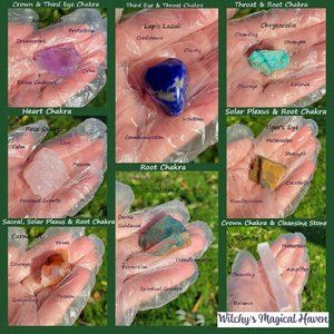 Chakra set includes the following Crystals. Each crystal covers one or more of the 7 Chakras, for the perfect workings for all aspects. (Information sheets included). All Stones are each approx. size 1" - 2.5" inches, .50 - .95 ounces.