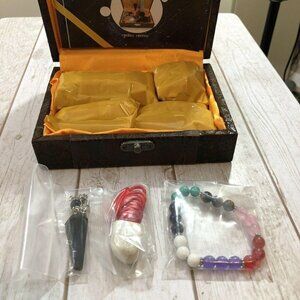 Features 16 pc Chakra Healing Crystals in Wooden Box New Perfect Gift Crystal Stones Set. This set contains a 5" x 6.5" x 2" wooden box with 4 large crystals, 1 red bag of 7 round flat stones, 2 necklaces and 1 bracelet and the box is wrapped in fabric.