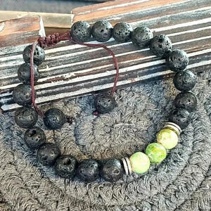 Made with 8mm black volcanic lava and aqua terra jasper gemstone beads