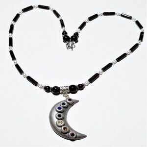 Made with 12mm Blue Goldstone tube beads, 6mm & 8mm Blue Goldstone beads, silver daisy spacers, 2mm silver ball spacers, 4mm pearled spacer beads and a 42mm handmade (not by me) & painted polymer clay moon with Chakra colored rhinestones. It is strung with dark blue Soft Flex wire with a lobster clasp closer. It measures 20” without the focal.