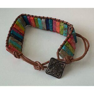 Chakra Rainbow Multicolored Stones Brown Corded Bracelet Silver Tone Closure 3.5