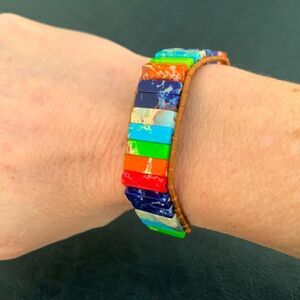 This colorful bracelet is designed with seven types of jasper stones, each linked to the body’s Chakra centers.