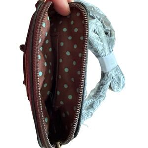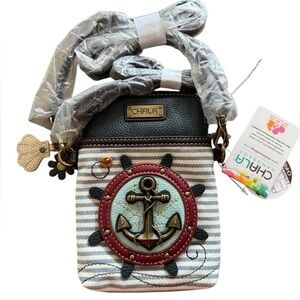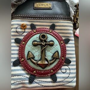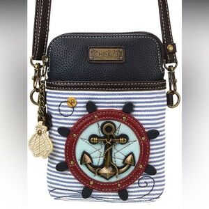 Small front pocket adorned with our Anchor design Adjustable strap - turn bag into a purse, a crossbody bag, or even a pouch! Top zipper closure Cute seashell zipper pull Soft lining inside 3 credit card slots inside 2 Adjustable straps that are detachable Extra padding throughout bag to protect your cell phone Materials: Faux Leather Color: Blue White Stripe Approx. Measurements: 5"W x 7.5"H x 1"D Strap adjustable: 7"-31" NWT excellent condition