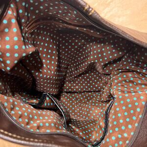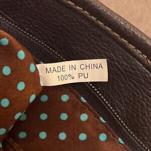 Dark brown base with flower shaped appliques, whipstitch trim, tan removable/adjustable shoulder strap, exterior zipper pocket & zipper closure.