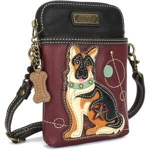 NWT: Stylish, multicolor "German Shepherd" vegan leather mini convertible crossbody/cell phone bag with an adorable German Shepherd applique / top zipper closure / decorative zipper pull / 3 credit card slots / 2 detachable & adjustable straps / versatile / contrast stitching / PETA approved by Chala.