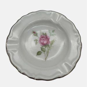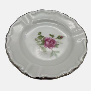 Pair of vintage Chalfonte (CPC) Porzellan ashtrays in the Rose pattern. The pattern has pink roses with green leaves and silver trim. The pattern is discontinued. Each ashtray measures approximately 3.25" across.