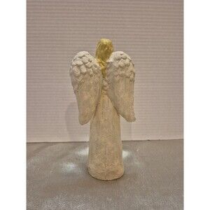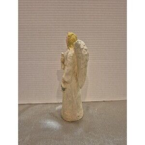 The product is a charming chalk painted angel figure with blond hair. The angel is depicted holding a bird and a birdhouse, with intricate details. The item is stamped, adding a unique touch to its design.