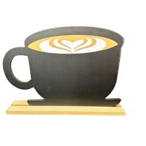 Charming double-sided chalkboard-style wood sign shaped like a latte mug with a step-by-step coffee recipe on front and latte art on back. Freestanding with wood base.