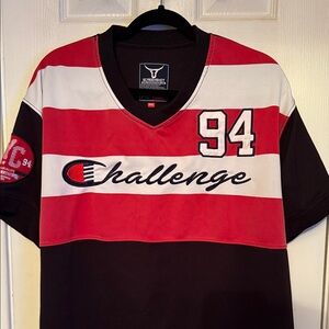 Step up your game with the Challenge men's jersey, showcasing bold red and black hues. Perfect for both sports and casual outings.