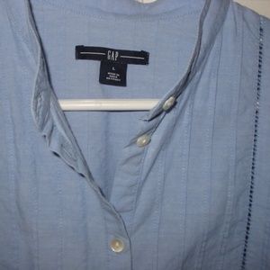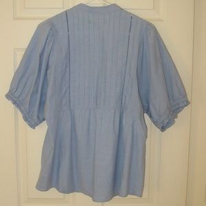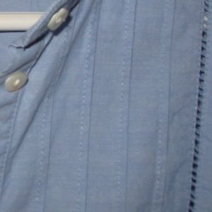 Nice light summer weight chambray type 100% cotton fabric button down tunic top with dainty pintuck in front and back, loosely gathered elastic sleeves, 27" top of neck to bottom hem; one tiny stain on side of right sleeve. Bundle any three $5 items and I'll send you an offer of $10 for all three. MUST BUNDLE