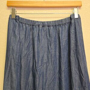 Tags/Keywords: chambray, cottage core, country, boho, feminine, peasant, denim maxi skirt, button down skirt, ruffle hem skirt, women's denim skirt, elastic waist skirt, vintage style skirt, casual maxi skirt, medium size skirt, blue maxi skirt, classic denim skirt, long button skirt, cotton ruffle skirt, lightweight denim skirt