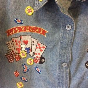vintage VS Collection short sleeve embroidered jean shirt....great Las Vegas embroidery on front...marked size s so please see measurements..probably men's sizing but could be for anyone...good preowned condition