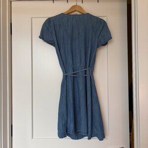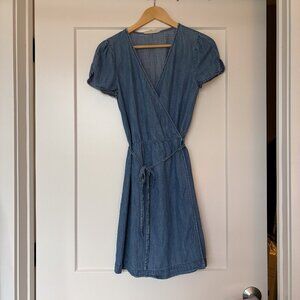 Cute and comfortable wrap dress made from the softest cotton-lyocell chambray fabric! Pretty tulip sleeve detail and wraps all the way around so no gaping ever happens. Flexible sizing with the wrap style and in excellent used condition! Machine washable. Medium denim blue color.