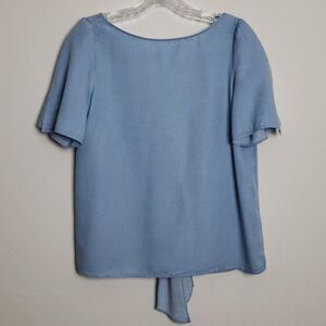 Chambray top with crewneck and flutter split sleeves and bow tie back. 100% lyocell.