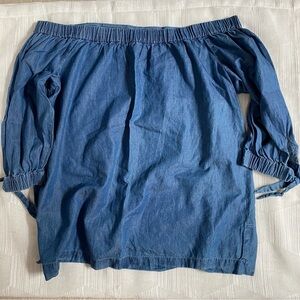 Chambray top, with off the shoulder style. Half sleeve length, and tie detail, and small side slits. Pre-loved, size M.