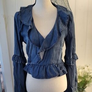 Chambray Ruffle Bohemian Crop Tie Blouse Size Large