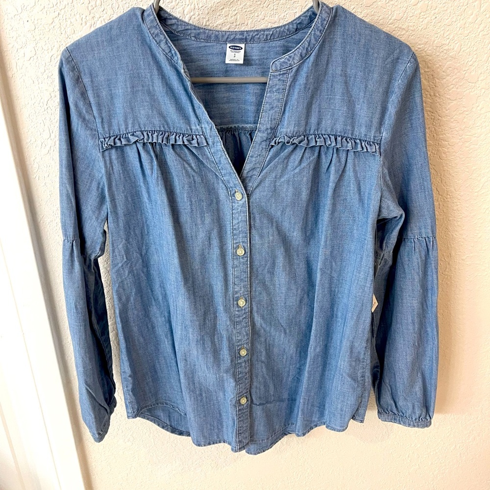 Chambray Old Navy Long Sleeve Top with ruffle detail. Size small. New with tags !