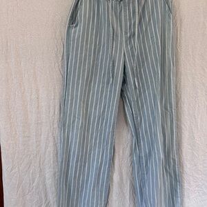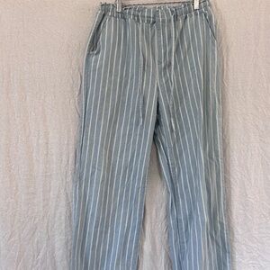 Wide Leg Chambray Striped pants. Includes zipper fly and slide closure and drawstring.