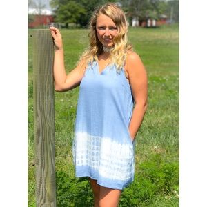 Excellent quality chambray tie dye shit dress. Featuring hidden slip pockets. Fully lined with hidden zipper closure up side Sean. Pair with a white sweater as a transition piece. Size S, M, L
