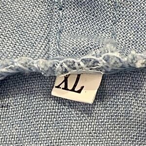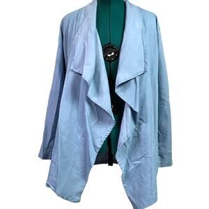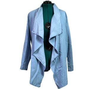 Women's asymmetrical chambray cascading open front cardigan. Light blue, No closure, Fold over shawl collar and roll tab sleeves. Crafted without stretch for a distinct silhouette. Size tag only. Size XL. Due to light & screen variations, colors may vary slightly from the images.