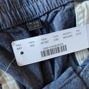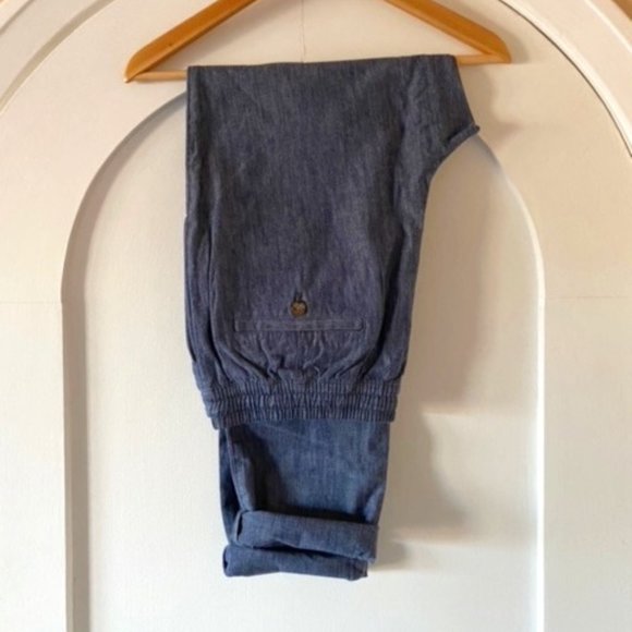 A great alternative to jeans, these chambray pants are lightweight and the elastic waist makes them very comfortable. Zipper and button closer along with drawstrings.
