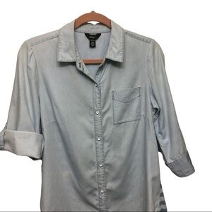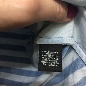 intro. ❤️ cotton/lyocell distressed chambray shirt in petite M. Front and sleeves are distressed cotton/lyocell 65/35% Back is stripped medium/light chambray with a flattering arched yoke in 100% cotton. Buttons are white with silver trim. Roll-tab 3/4 sleeve. Lyocell gives this great shirt a high quality look and feel. Good preowned condition.
