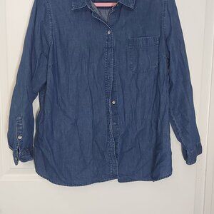 From the website: "Our soft cotton button-down shirt is the perfect wardrobe staple on its own or layered under a sweatshirt or cardigan. It has all the hallmarks of the classic denim shirt: A-line silhouette, shirt collar, buttoned cuffs and a shirttail hemline. We’ve placed a patch pocket on the chest for dimension and practical appeal. Agoya-shell buttons. 100% cotton woven"