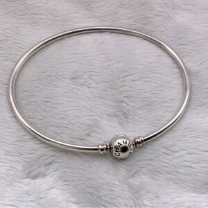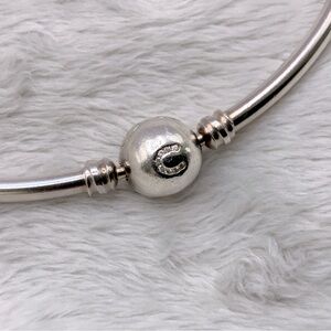 Chamilia sterling silver bangle with signature round clasp marked CHAMILIA on one side & a C filled with small clear CZ on the other.