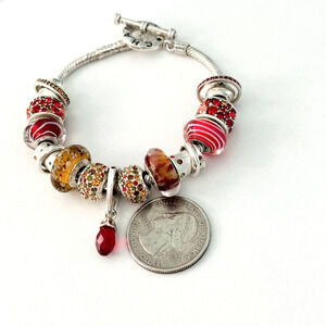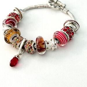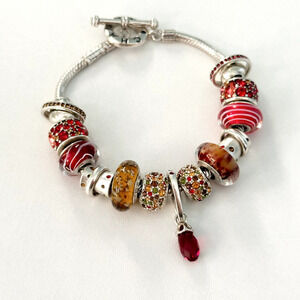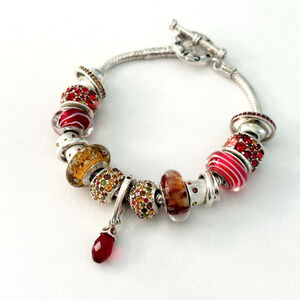 Chamilia Sterling Silver Red Orange Crystal Murano Bead Loaded Charm Bracelet