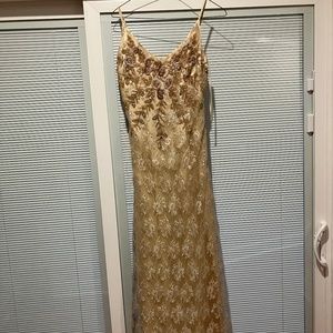 Floor length champagne colored dress. Covered with a lace overlay with a gorgeously beaded and embroidered bodice. Exposed back about mid-way down the back, with braided, adjustable corset tie.