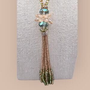 Make a luminous statement with this elegant vintage single-strand necklace featuring champagne bronze-tone faceted beads. The focal point is a striking tassel pendant adorned with shimmering aurora borealis-style beads that catch the light beautifully. A cluster of blush-toned crystal accents forms a delicate floral motif above the tassel, adding a soft, elegant touch to the radiant shimmer.