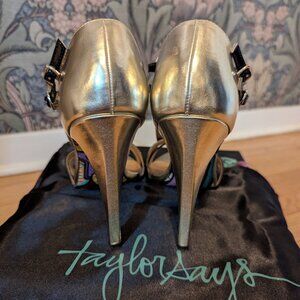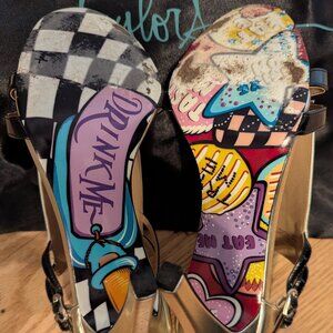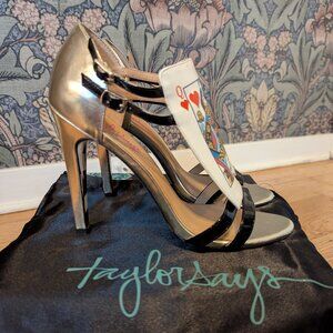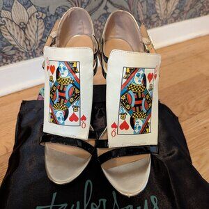These striking Taylor Says "Decklan" champagne and black 4-inch heels are a true statement piece! Featuring a unique Queen of Hearts playing card design on the heel, they are sure to turn heads. The sleek black patent leather straps elegantly frame the foot. Perfect for adding a touch of playful sophistication to any outfit. These eye-catching heels are in excellent condition and come with their original dust bag. Make a bold fashion statement with these unforgettable Taylor Says heels!