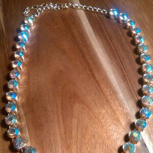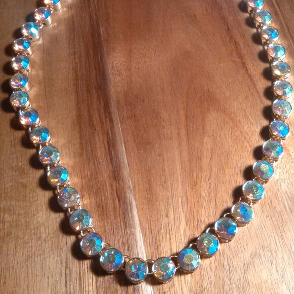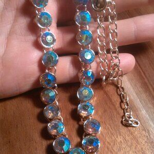This sparkly necklace features champagne color Austrian crystals. The necklace is set in goldtone and has an adjustable length of 20 to 22 inches. Brand new.