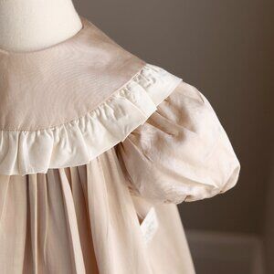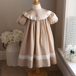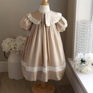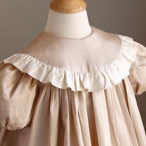 This Little Girl's Champagne Float Dress is pure Luxury!! The dress is done in a blend of 55% Cotton and 45% Silk (both natural/eco-friendly fibers!!)- so soft and Luxurious (the silk giving a slight sheen). The float style dress has a Champagne base with Creme/Ivory accents. An oversized collar has an Ivory/Creme ruffle. The bottom of the dress has a matching Ivory/Creme band. The sleeves are unique on this little dress. Fashion savvy sleeves are done in a balloon style. Sleeves are lined for volume. Back has an upper button closure done in matching fabric covered buttons (a high-end detail). A Super Sweet little Flower Girl Dress. Made by a Division of The Bailey Boys (a high-end children's apparel) Great for wedding guests, portraits or other Special Occasions. Pair with Ivory/Creme Ballet flats and a big Ivory/Creme hair bow or headband and your little one is set! Would look great with ivory tights and Black patent Mary-Janes also for cooler weather. Unique and rare find!! Like-New, PERFECT CONDITION