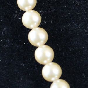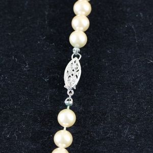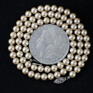 This strand of Champagne Pearls is 20” in length. It weighs 29.5 grams. There are 79 pearls which are 6+mm in size. The clasp is stamped “sterling”.