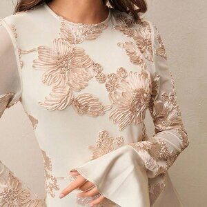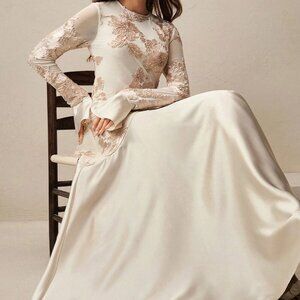 Elevate your style with this elegant long maxi dress, featuring a slim fit, round neck, and extra‑long satin flared sleeves end . The champagne hue adds a subtle elegance & romance, while the satin A‑line silhouette creates a flattering flow from the embroidered bodice to the floor. Designed for cocktail events, evening gatherings or upscale affairs, the design balances classic refinement with modern polish.