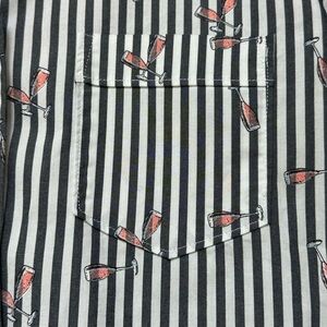 Gray and white pinstripes with peach colored champagne flute print throughout