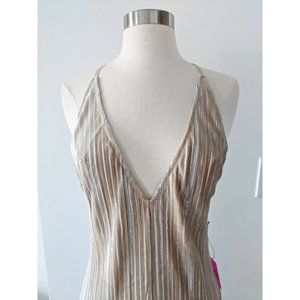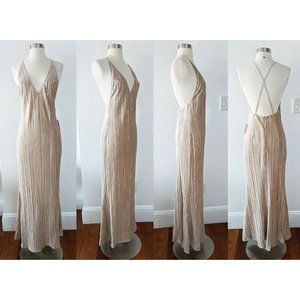 Champagne/beige/nude color, velvet ribbed knit maxi floor-length dress features metallic detailing throughout, a deep v-neckline, adjustable cami straps that cross in the back, and concealed back zip closure.