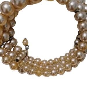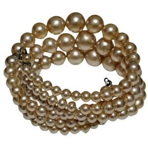 Champagne Pink Graduating Faux Pearl Three Strand Memory Wire Cuff Bracelet. Leather pearls are in the center and gradually decrease in size until they are tiny.