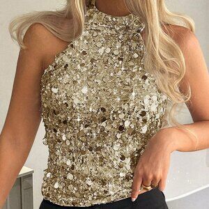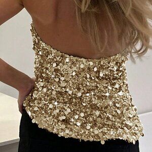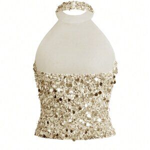 Turn heads at any celebration with this champagne sequin party top, designed in a strapless halter style that delivers a bold, sexy silhouette. The regular fit and regular length provide comfortable coverage while the shimmering sequins catch the light for a glamorous effect. Perfect for cocktail events, night outs, or special occasions where a dazzling, eye‑catching look is essential.