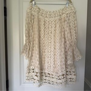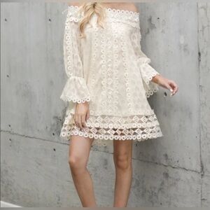 Champagne & Strawberry Elegant Cream Off-the-shoulder Lace Women's Dress Small. I absolutely love this dress! You can use it while pregnant as well!