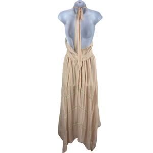 Beautiful champagne and strawberry maxi dress, perfect for spring! This fairycore coquette style dress features a halter tie, a flowy cut bottom, delicate lace detailing, and a charming pink stripe.