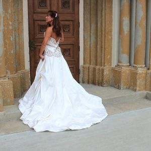 Fall/Winter❤️Stunning pure silk runway wedding gown with amber and clear colored Crystals, I was told they are Swarovski Crystal's. This beauty was worn for a wedding show and picture shoot. I baught this for my wedding and was unable to wear it due personal situation. Never altered. Need little cleaning after fitted. My wedding was supposed to be in the Fall I was going to add a black cumberbund and longbow the back of the dress as to match black tuxedo.