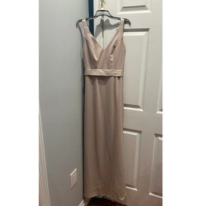 Beautiful fitted champagne wedding guest dress with partial open back!